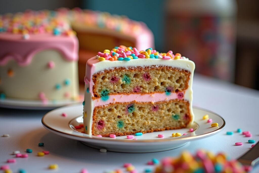Die Optik: Die bunten Streusel, die im Teig und auf dem Frosting verteilt sind, machen den Kuchen zu einem echten Hingucker. Sie erinnern an Konfetti, das in die Luft geworfen wird, und verbreiten sofort gute Laune.
