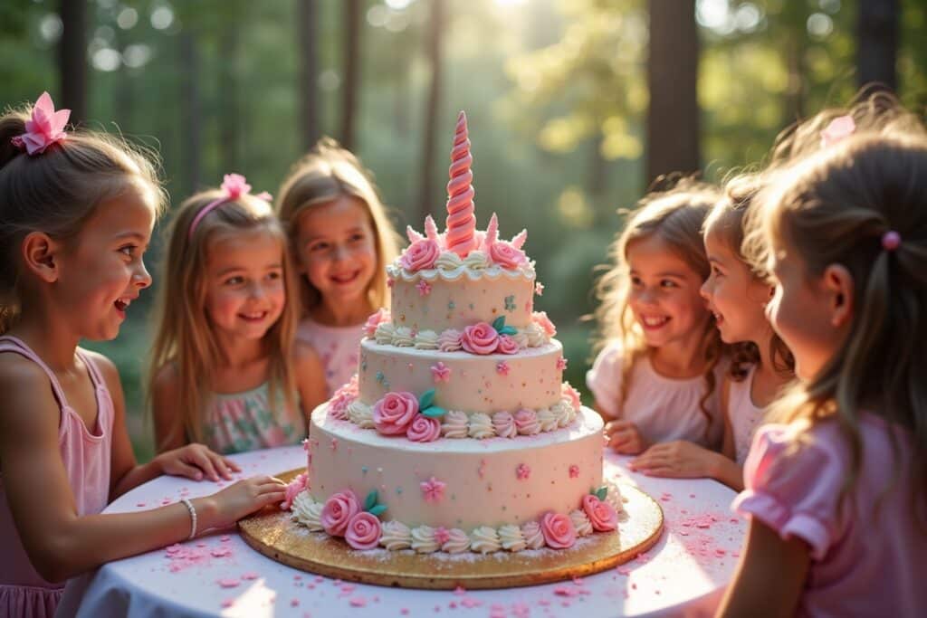- Regenbogen-Torte: Eine Torte mit einem Regenbogenmuster, verziert mit kleinen Einhörnern.