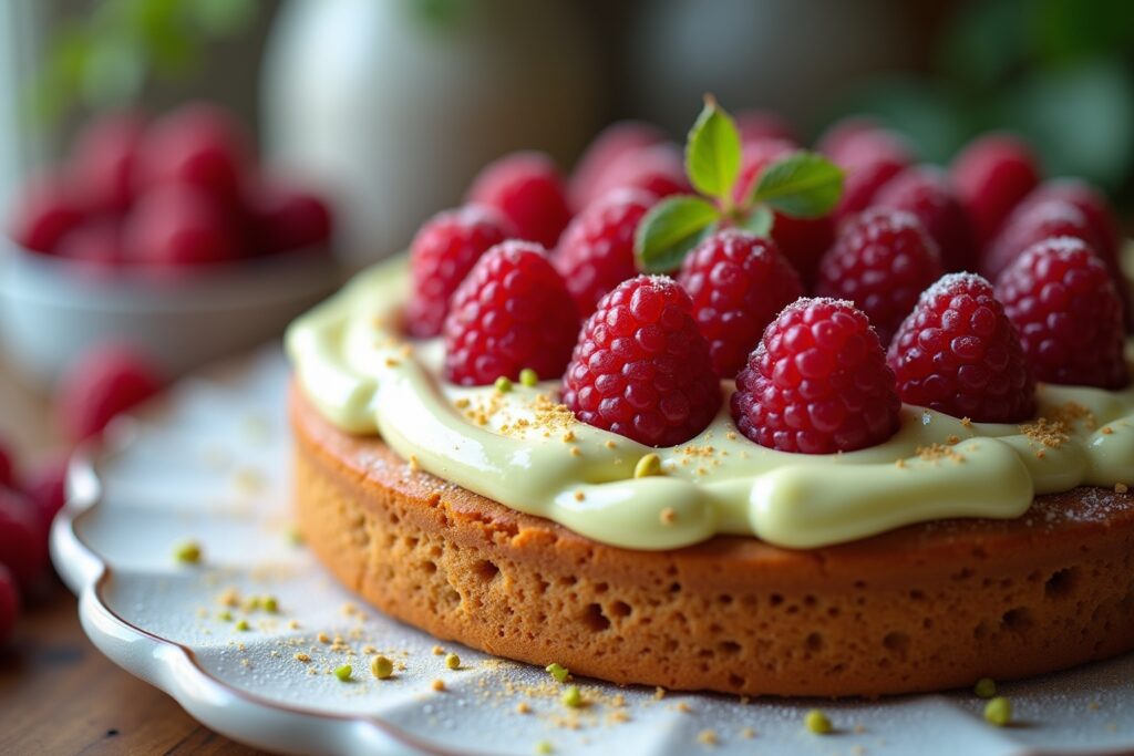 - Dekoriere die Torte mit gehackten Pistazien und frischen Himbeeren.